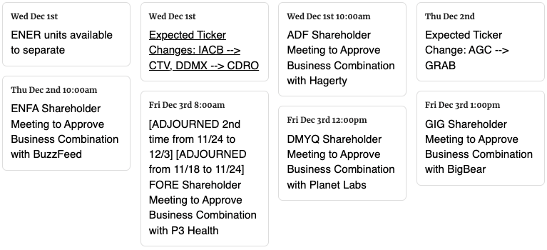 This Week’s Announced Shareholder Meetings, Unit Splits, Warrant Redemptions, Earnings, and Expected Ticker Changes