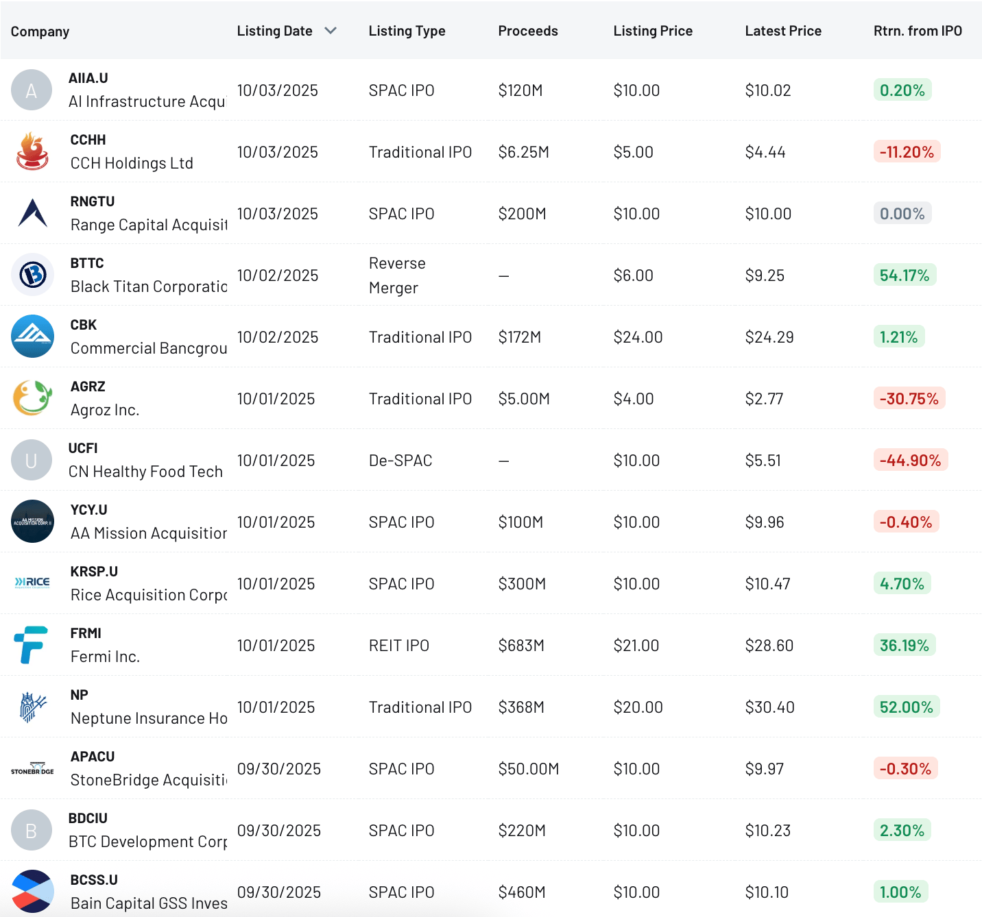 This week’s ListingTrack Theme Performance table offers a snapshot of sector trends and innovation leadership. Quantum saw Rigetti Computing (RGTI) up 28%, Nuclear's top gainer was KULR Technology Group (KULR) at 28%, and Defense was paced by BlackSky Technology (BKSY) surging 30%. In Core AI / Infra, SanDisk (SNDK) rallied 32%, Pagaya Technologies (PGY) dropped 15%. Next Wave AI saw Richtech Robotics (RR) soar 47% and Klaviyo (KVYO) fall 16%. New Space's top mover was AST SpaceMobile (ASTS), up 38%, while Firefly Aerospace (FLY) sank 24%. Big Tech was led by NVIDIA (NVDA) up 5%, and Netflix (NFLX) off 5%. Logistics/LogTech featured Symbotic (SYM) up 15% and Forward Air (FWRD) down 12%.