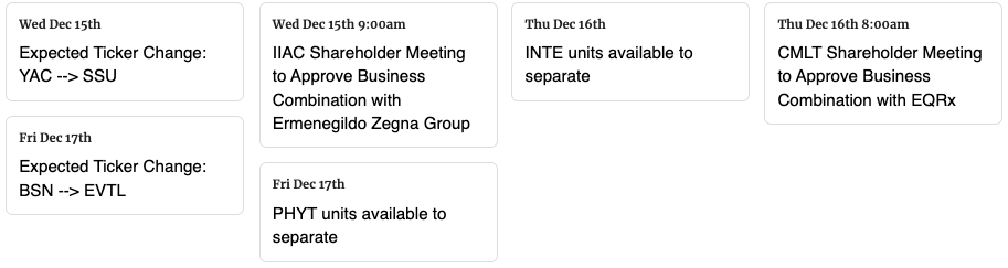 Upcoming Announced Shareholder Meetings, Unit Splits, Warrant Redemptions, Earnings, and Expected Ticker Changes