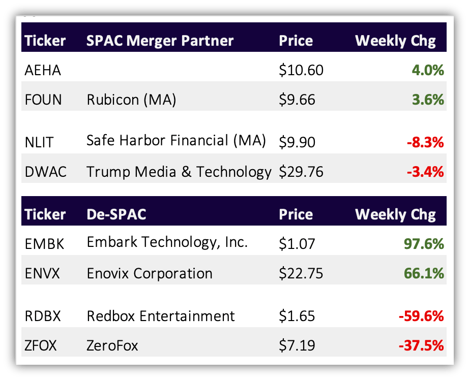 There were 4 deals announced this week, however, a flurry of terminations and a couple of IPOs resulted in an increase in the number of SPACs searching for a dance partner.